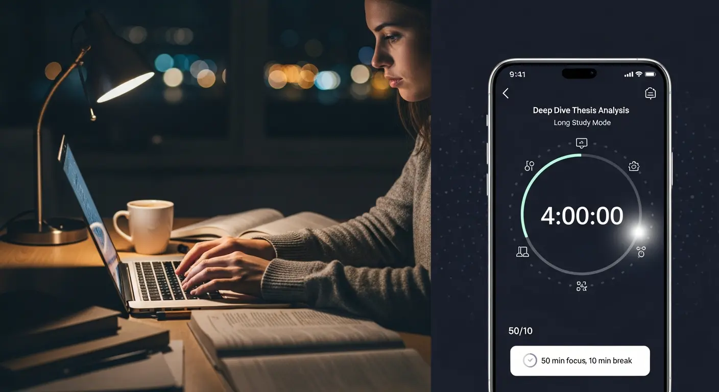 Writing a thesis or dissertation requires a different kind of stamina. Our Study Timer's 'Long Session' mode encourages 50/10 intervals, giving your brain just enough time to recharge without breaking the flow state required for complex writing.
